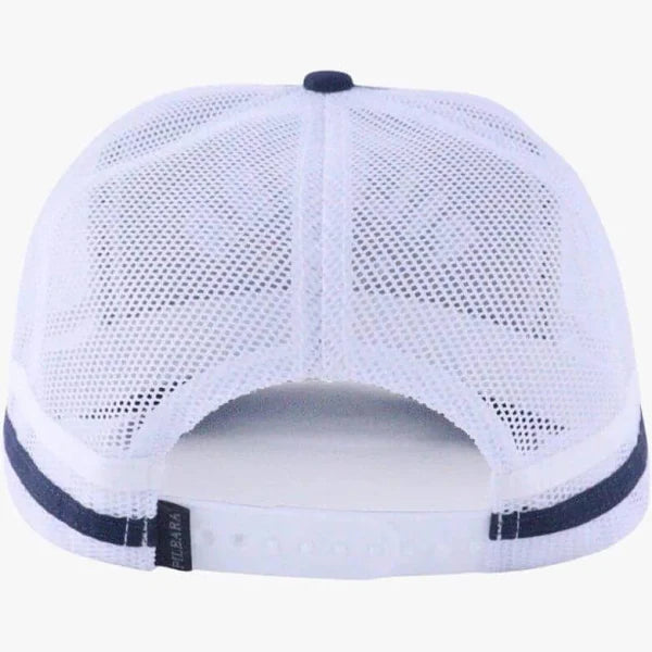 Crafted from 100% heavy cotton, the Pilbara Classic Cap offers durability and comfort for all-day wear. Its structured 5-panel design features a pre-curved peak and sewn eyelets on the front panel for breathability. The white mesh side and back panels are accented with contrast fabric stripes that complement the peak. Highlighting its rugged style, the cap showcases a high-build 3D embroidery of 'Pilbara Western Red Earth - Blue Sky' on the front, combining regional inspiration with expert craftsmanship. Ideal for those seeking both function and distinctive regional character in a cap.
