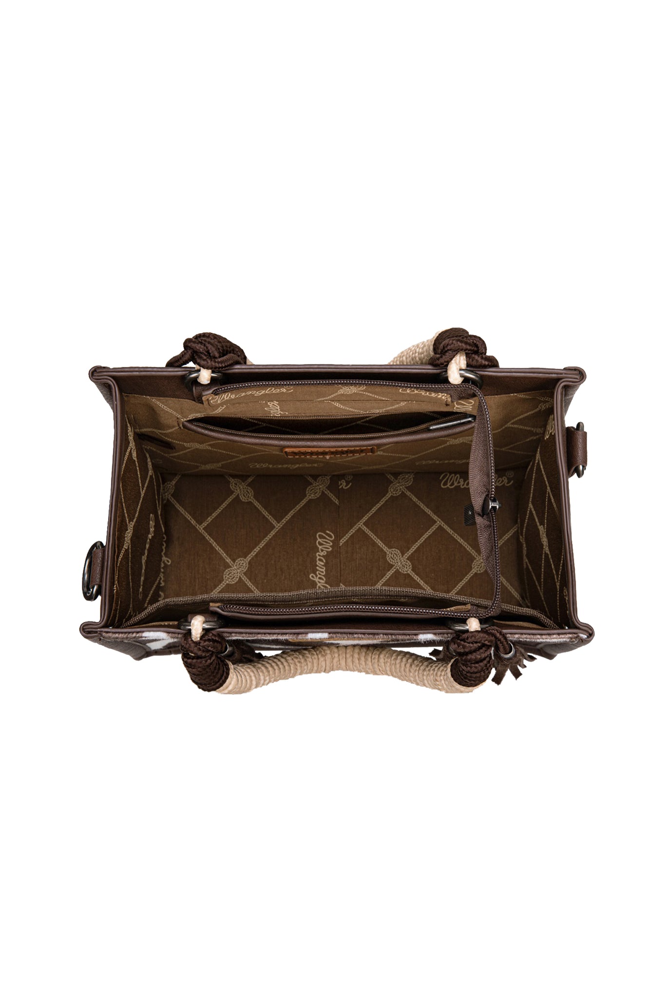 Elevate your everyday carry with this striking Wrangler Cow Print Tassel Crossbody Bag. Crafted from durable canvas and PU, it features eye-catching cow print fabric paired with rustic rope handles and playful suede tassels. The secure top zip closure keeps your essentials safe, while the detachable and adjustable crossbody strap offers versatile styling options. Inside, discover an internal zip pocket and slip pockets for organized storage. Finished with the iconic Wrangler logo badge, this compact 27cm x 21.5cm x 12.5cm bag blends function with distinctive country style.